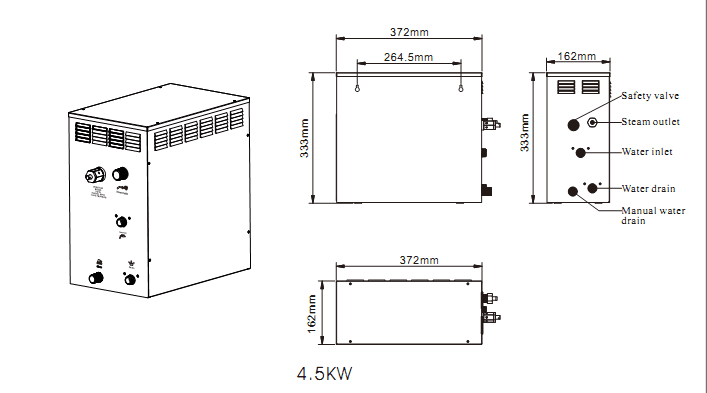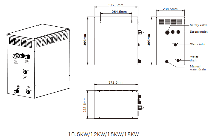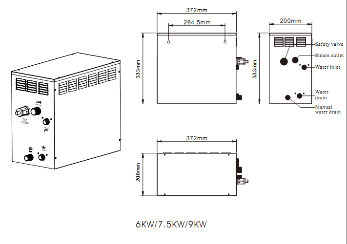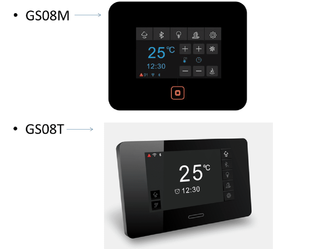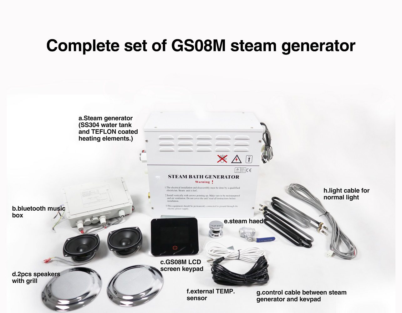 GS08M series is available in 4.5kW,6kw,7.5kw, 9kw,10.5kW,12kW,15kW,18kW,the users could choose different KW according to their steam room size. GS08M steam generator comes with GS08M control panel. Multi steam generators can be work together with one control panel, or 2pcs control panels can be work together with one steam generator.