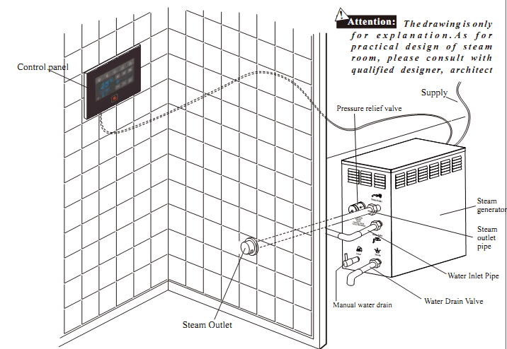 | Touch screen control panel | Waterproof. Installed inside or outside of steam room |